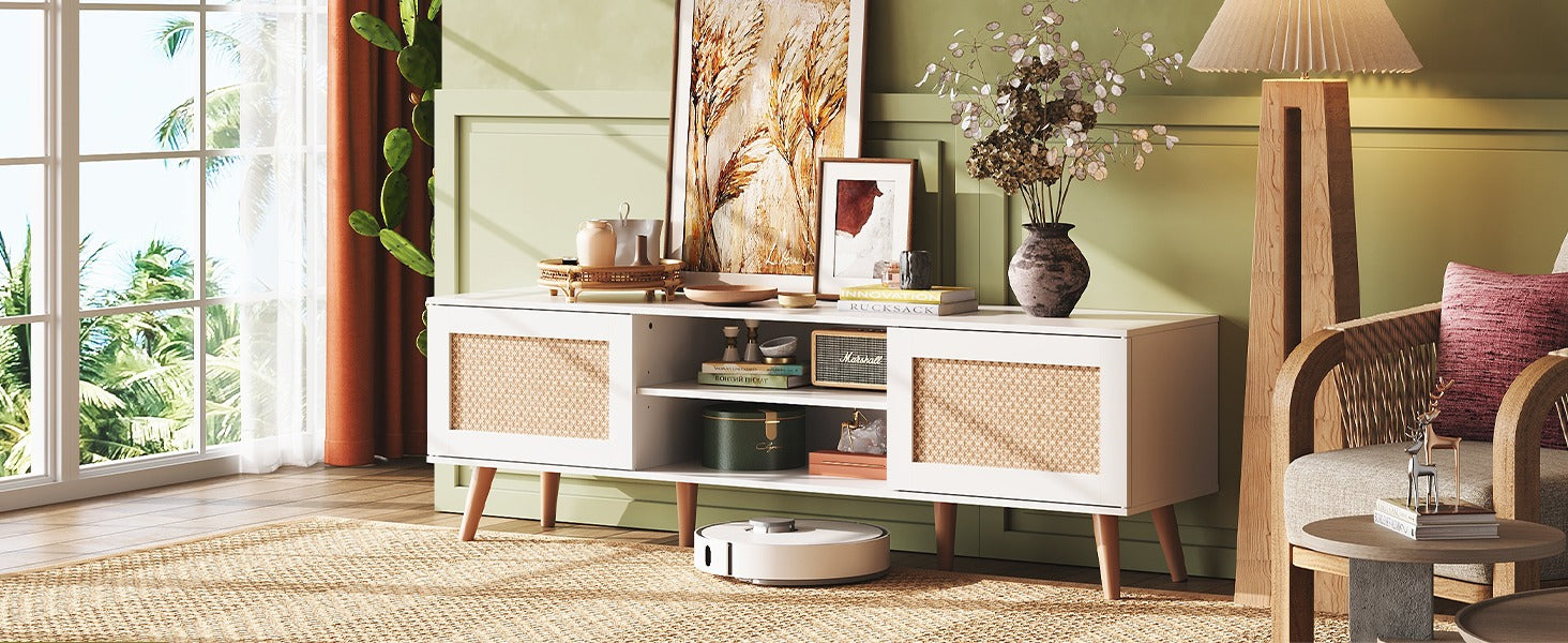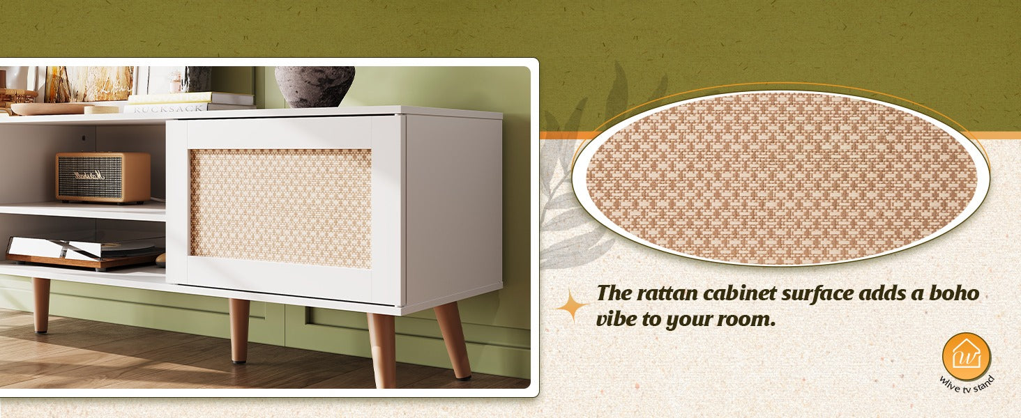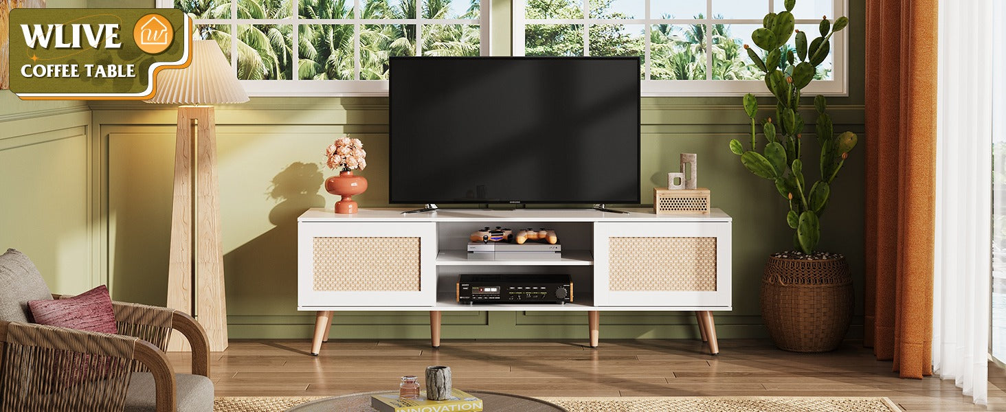 WLIVE Boho TV Stand with 2 Rattan Cabinets for 65 Inch TV