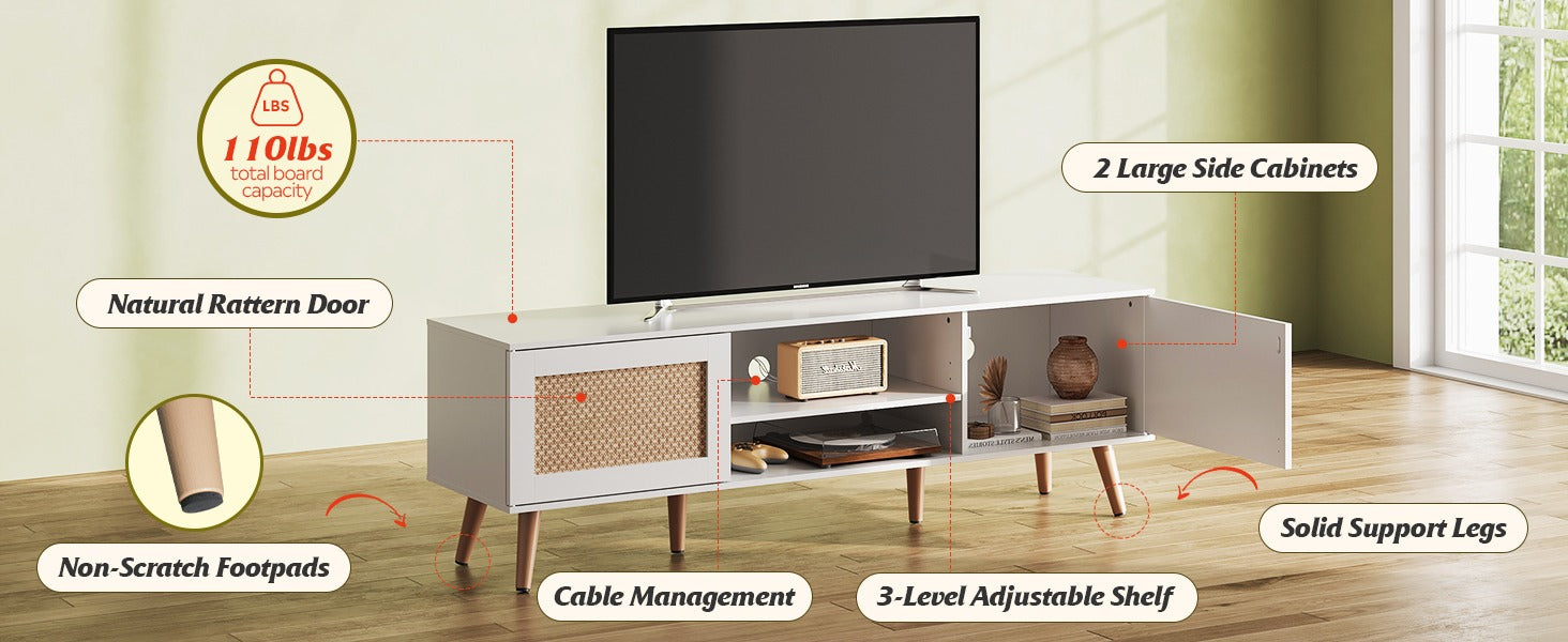 TV stand for 65" TVs, 2 rattan doors, eco-friendly particleboard, adjustable shelf, and stable angled legs.