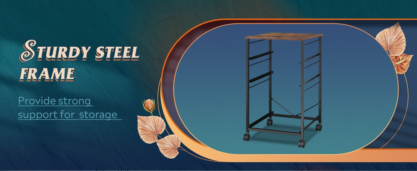 MDF top, steel frame, 1 file drawer, rolling wheels with brakes.