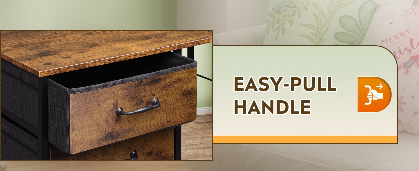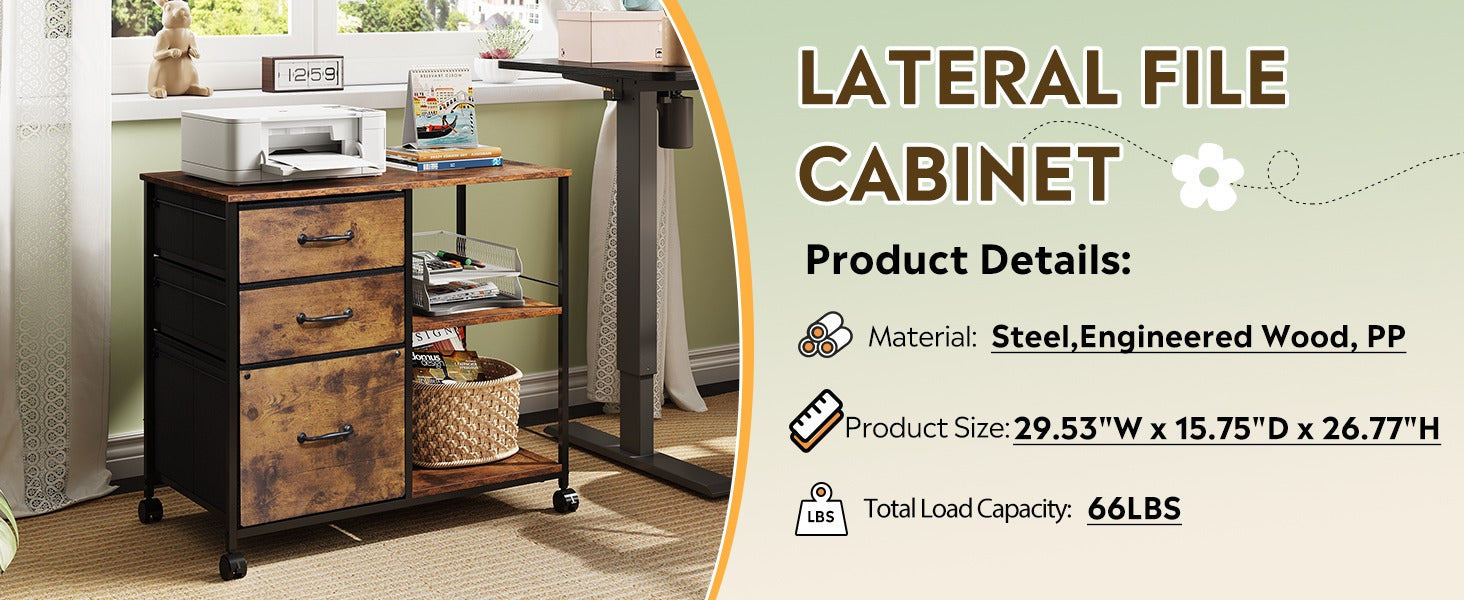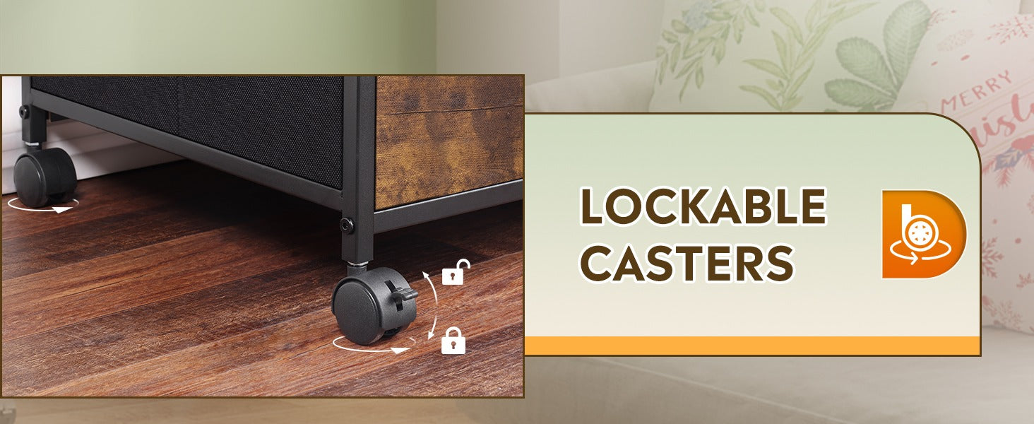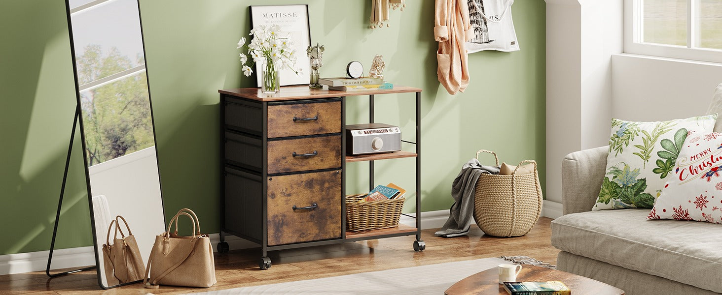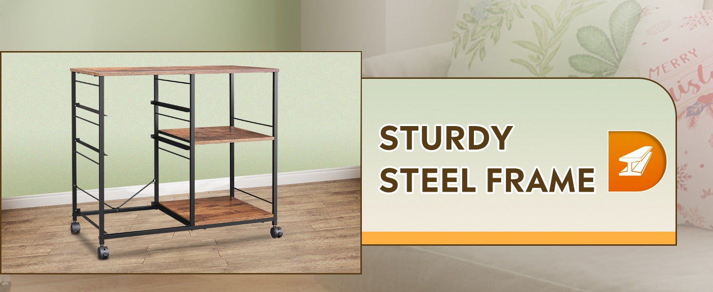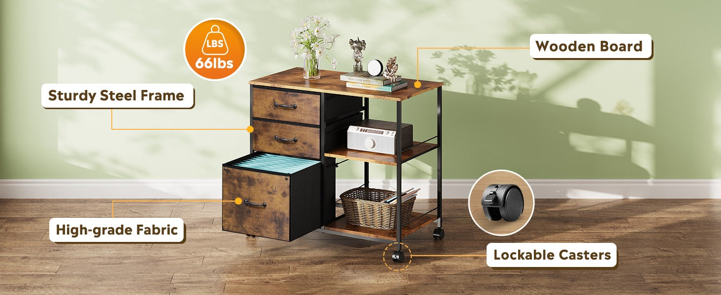 MDF top, steel frame, 3 fabric drawers, 4 rolling wheels, 2 lockable.