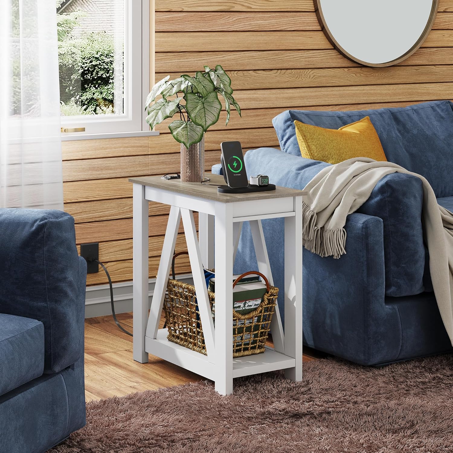 WLIVE Farmhouse Narrow 2-Tier Side Table with Charging Station