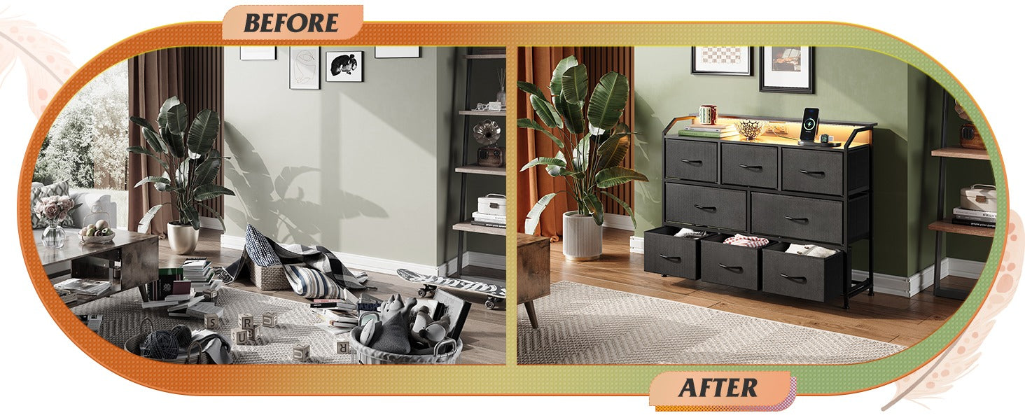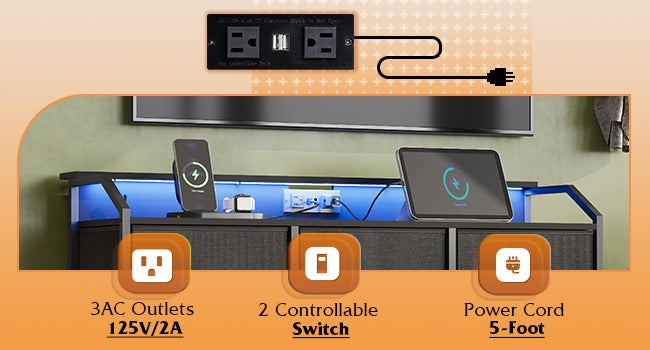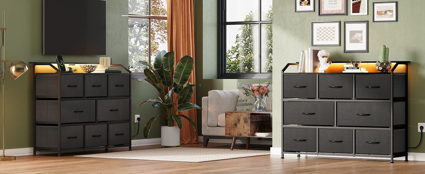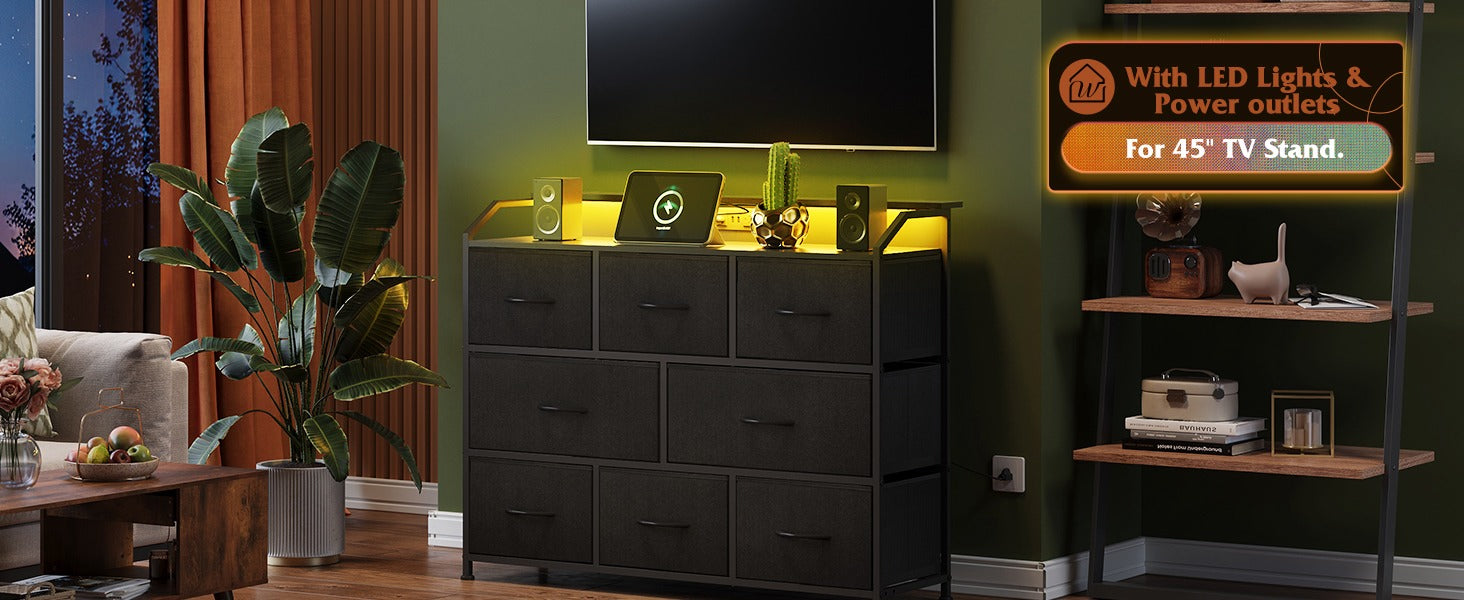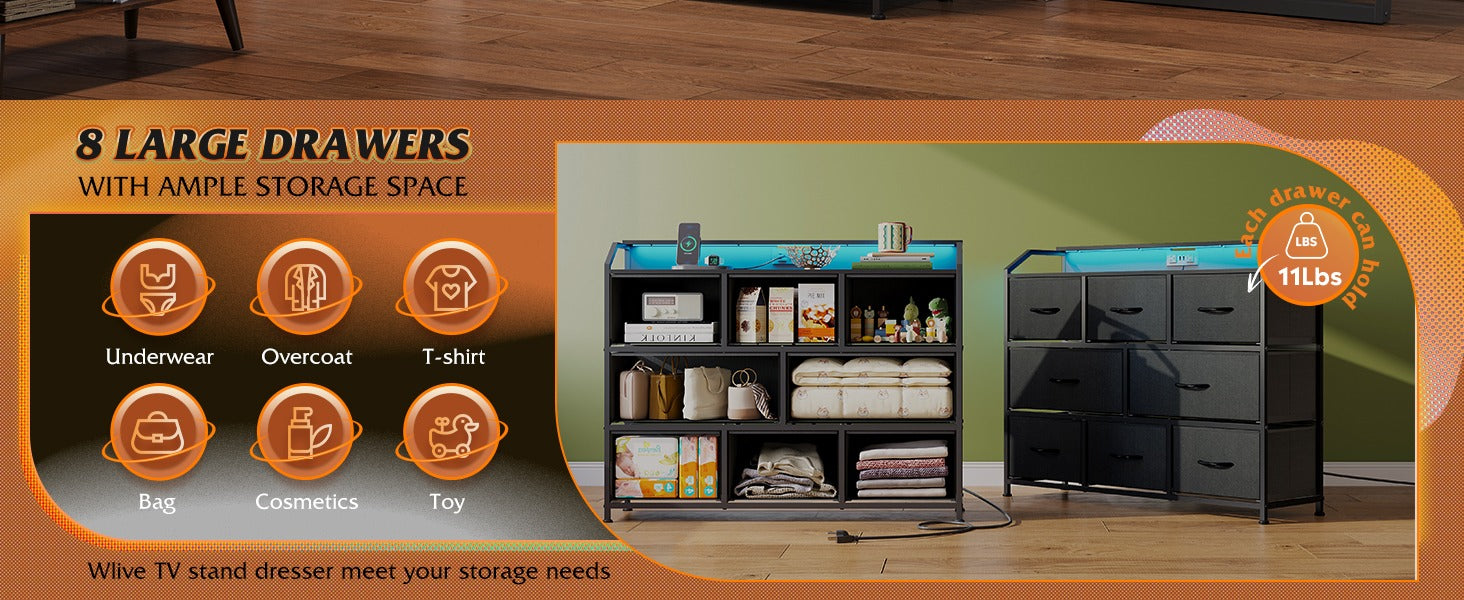 WLIVE Minimalist 8-Drawer LED Large Storage Fabric Dresser TV Stand