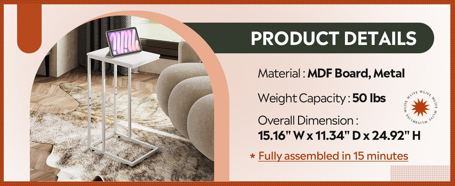 WLIVE Modern C Shaped Side Table with Large Desktop (24.92 in. H)