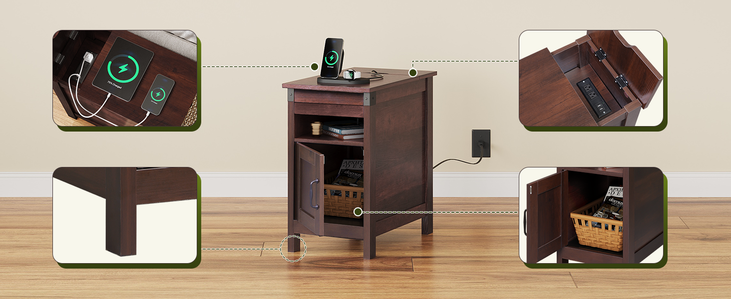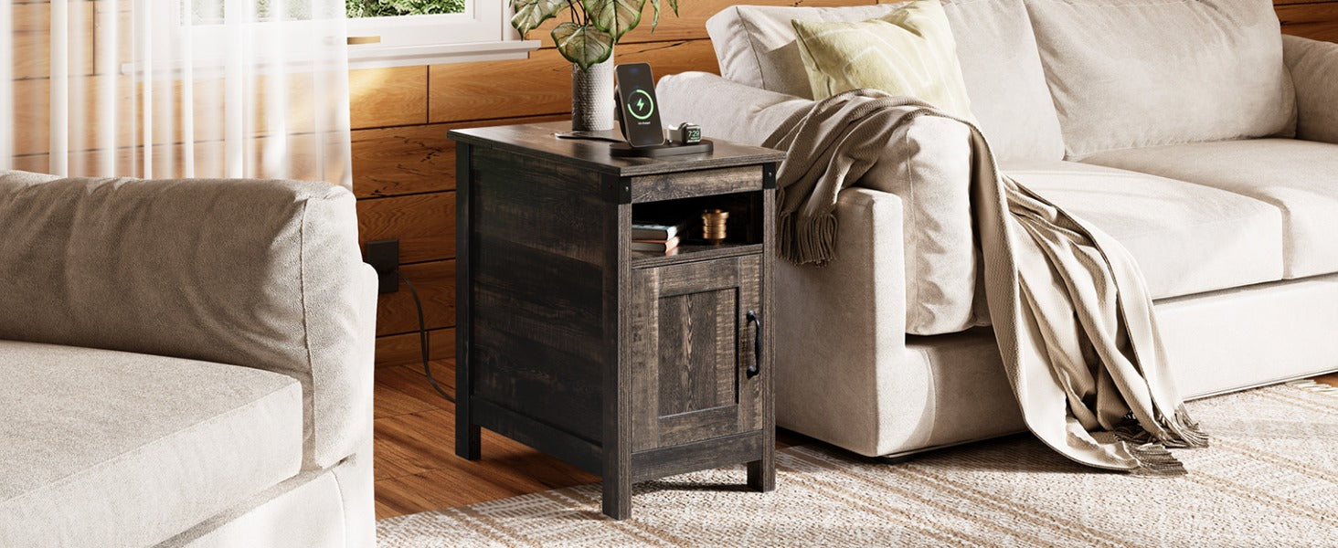 WLIVE Narrow Vintage Charging Side Table with Cabinet