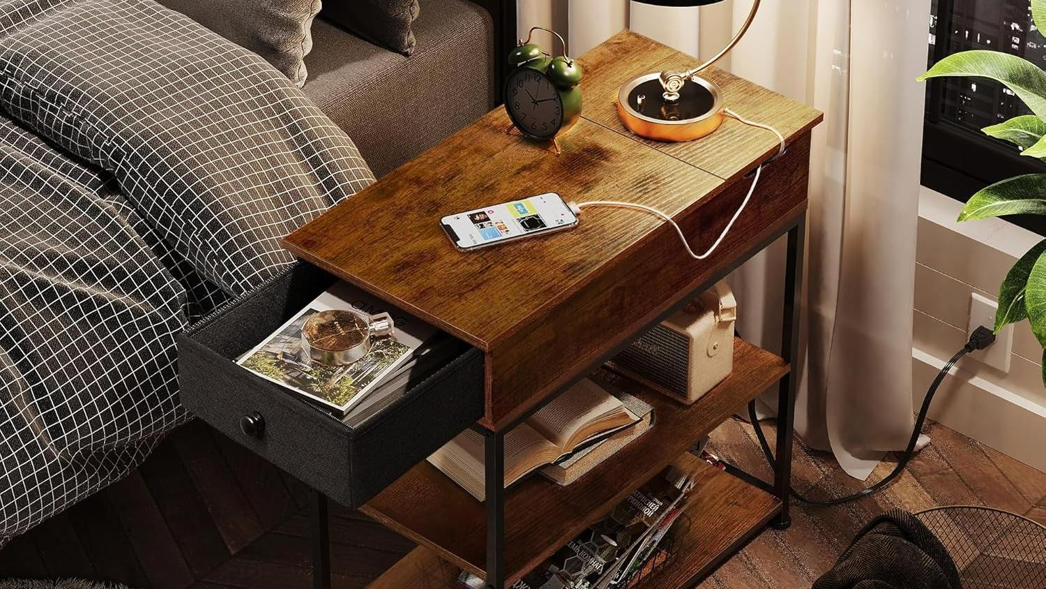WLIVE Small Wood Storage Side Table with Charging Station
